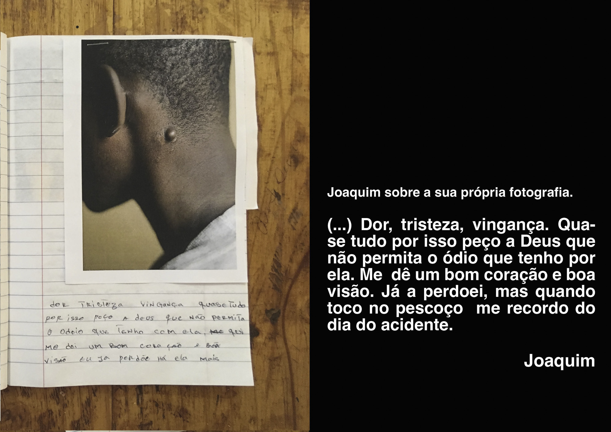 Perdido/achado (Lost/Found), the name subsequently given to the exhibition and the entire project, was inspired by the first exercise in the workshop, which saw images entering the prison. These were nothing more than photocopies of several photographs by renowned artists (Malik Sibidé, Martin Parr, Ricardo Rangel, Dana Lixemberg, Lauren Greenfield) that function as a normal projective exercise used in art therapy, in which the images are placed on the floor and each participant chooses one, talking about the emotions that the photo conveys to them. Here, photography manifests itself in one of its most characteristic tensions, that between lost and found. The first pairs of opposites emerge: lost/found and inside/outside. Everything speaks of an interruption, of a before and after, brought back to light by the power of images. In the “invisible photo” exercise, where we take photos with our eyes (or with a black card) but not yet with a camera, the gaze intercepts spatial thresholds, where portions of space fall “inside” and others “outside”, tracing a connection with the inner discourses that inhabit the minds and hearts of the participants. Far from overstimulating these discourses, we are content for them to emerge as fragments, in written form in their photo-diaries, in the form of a mosaic of written fragments and meaningful images over the passage of time.